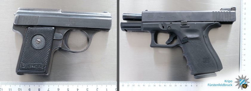 In dem Anwesen stellten die Ermittler zwei Pistolen (siehe Polizei-Foto) als mutmaßliche Tatwaffen sicher. Parallel zu den umgehend gestarteten umfangreichen Maßnahmen am Tatort und zur Rekonstruktion des Geschehens in dem Anwesen waren laut heutiger Mitteilung des Polizeipräsidiums Oberbayern-Nord auch intensive Ermittlungen zur Herkunft der besagten beiden Schusswaffen geführt worden, für die keine waffenrechtliche Erlaubnis vorgelegen habe.