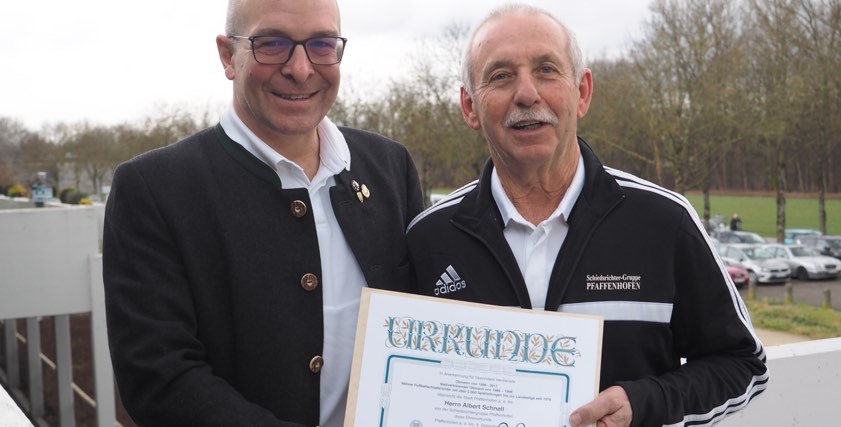 (ty) Eine Ehrenurkunde der Stadt Pfaffenhofen für besondere Verdienste im Fußball-Schiedsrichterwesen durfte der hiesige Schiedsrichter-Obmann Wolfgang Inderwies (Foto oben, links) seinem Vorgänger, dem Pfaffenhofener Ehre-Schiedsrichter-Obmann Albert Schnell (rechts), überreichen. Schnell hatte sein Amt vor gut zwei Jahren an Inderwies übergeben, ist aber nach wie vor mit Rat und Tat zur Stelle, wenn er seiner Schiedsrichter-Gruppe helfen kann.