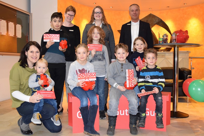 Bei der Gewinn-Übergabe wies Marktbereichsleiter Bernhard Mayer von der Sparkasse (Foto oben, hinten rechts) noch einmal auf die elementare Förderung des Hüpfburg-Events durch sein Geldinstitut hin und beglückwünschte die kleinen Gewinner gemeinsam mit seiner Stellvertreterin Martina Kreitmayr (hinten links) und Emily Staacke (hinten Mitte). Sie überreichte auch die Gutscheine für die Konto-Gutschriften: je einmal 200, 150, 100 und 50 Euro sowie sechs Mal 20 Euro. Luftballone und Sparschweine durften gab es obendrauf.