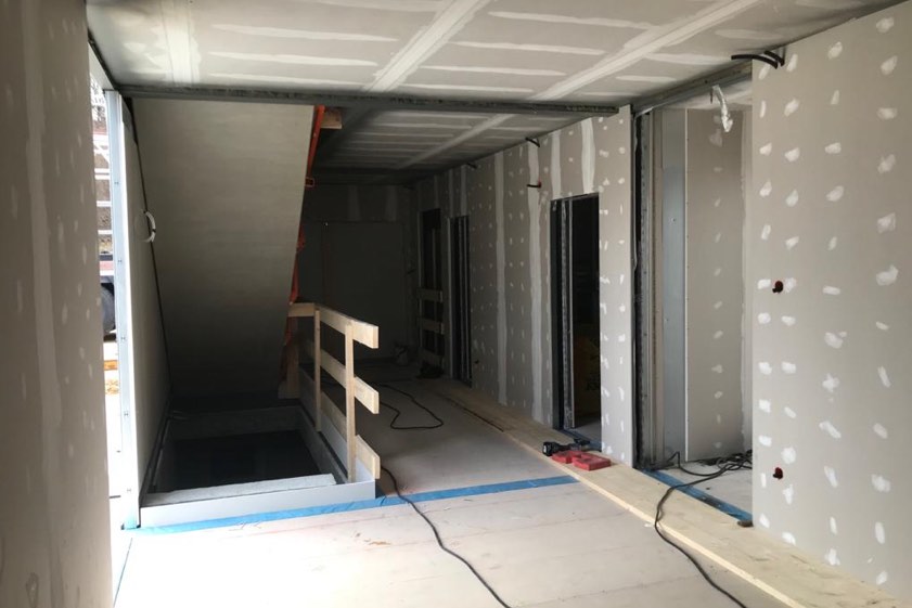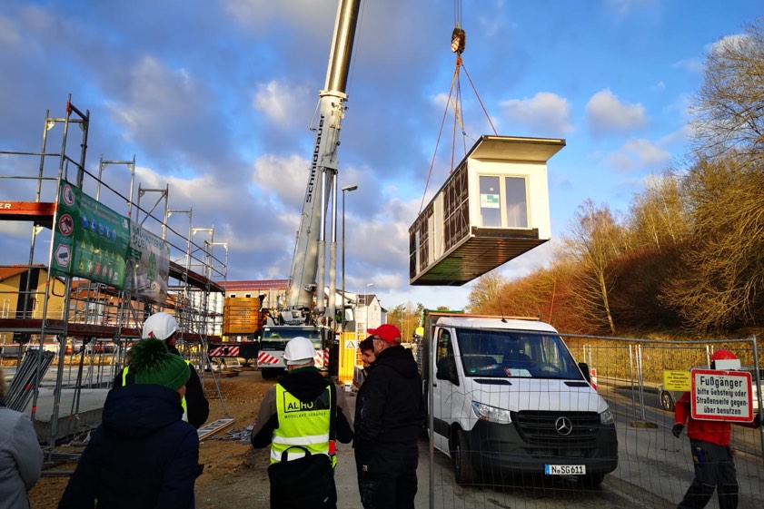 Vor wenigen Wochen konnte der Keller fertig gestellt werden. Nun erfolgte ein weiterer Meilenstein: "Alho" lieferte das erste Modul an und montierte es auf den Keller. Innerhalb von zehn Tagen sollen alle 68 Module angeliefert und zum Rohbau montiert werden, bevor es dann an den Innenausbau geht. Die Module haben jeweils eine Größe von bis zu 13 Metern Länge, 4,50 Metern Breite und 3,65 Metern Höhe und wiegen bis zu 18 Tonnen. Bereits im Juni dieses Jahres soll das Gebäude komplett fertiggestellt sein.