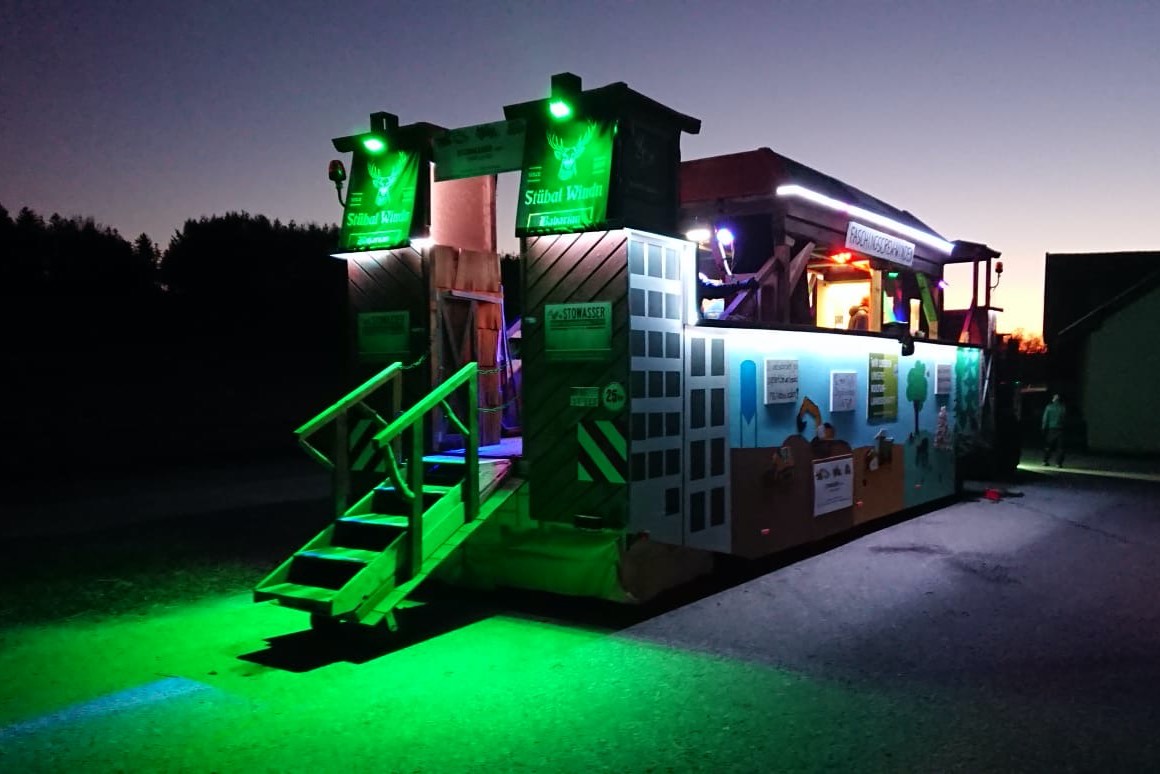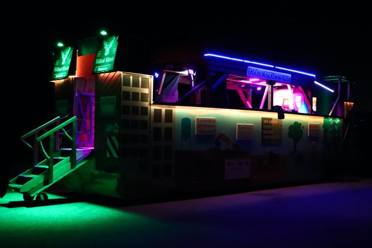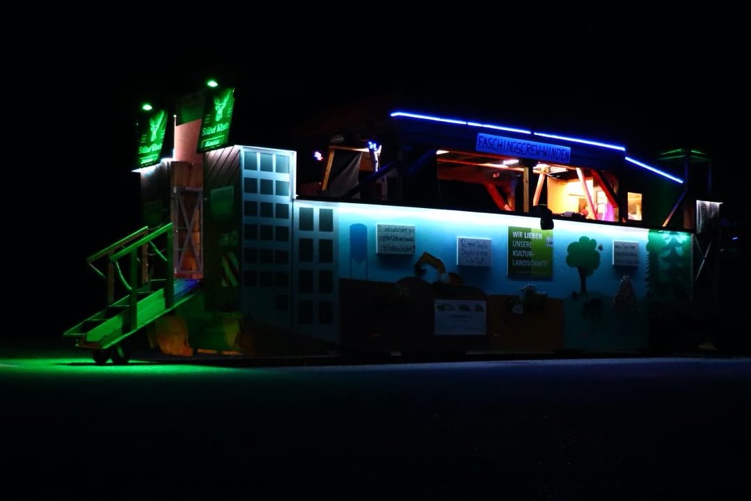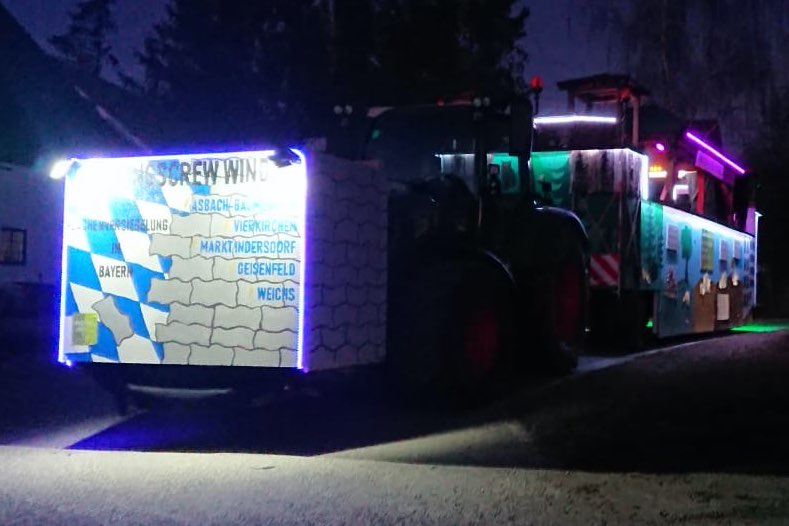 Zu sehen sind die Burschen und Mädels mit ihrem Mottowagen am heutigen Freitagabend beim Nacht-Umzug in Asbach-Bäumenheim im schwäbischen Landkreis Donau-Ries (wo sie in zwei Reisebussen und mit insgesamt 110 Leuten anreisen, die meisten davon Freunde oder gute Bekannte der Organisatoren), am Samstag in Vierkirchen, am Sonntag in Markt Indersdorf, am Montag in Geisenfeld und schließlich am Dienstag in Weichs. Danach wird der Wagen abgebaut und bis zum nächsten Fasching eingelagert.