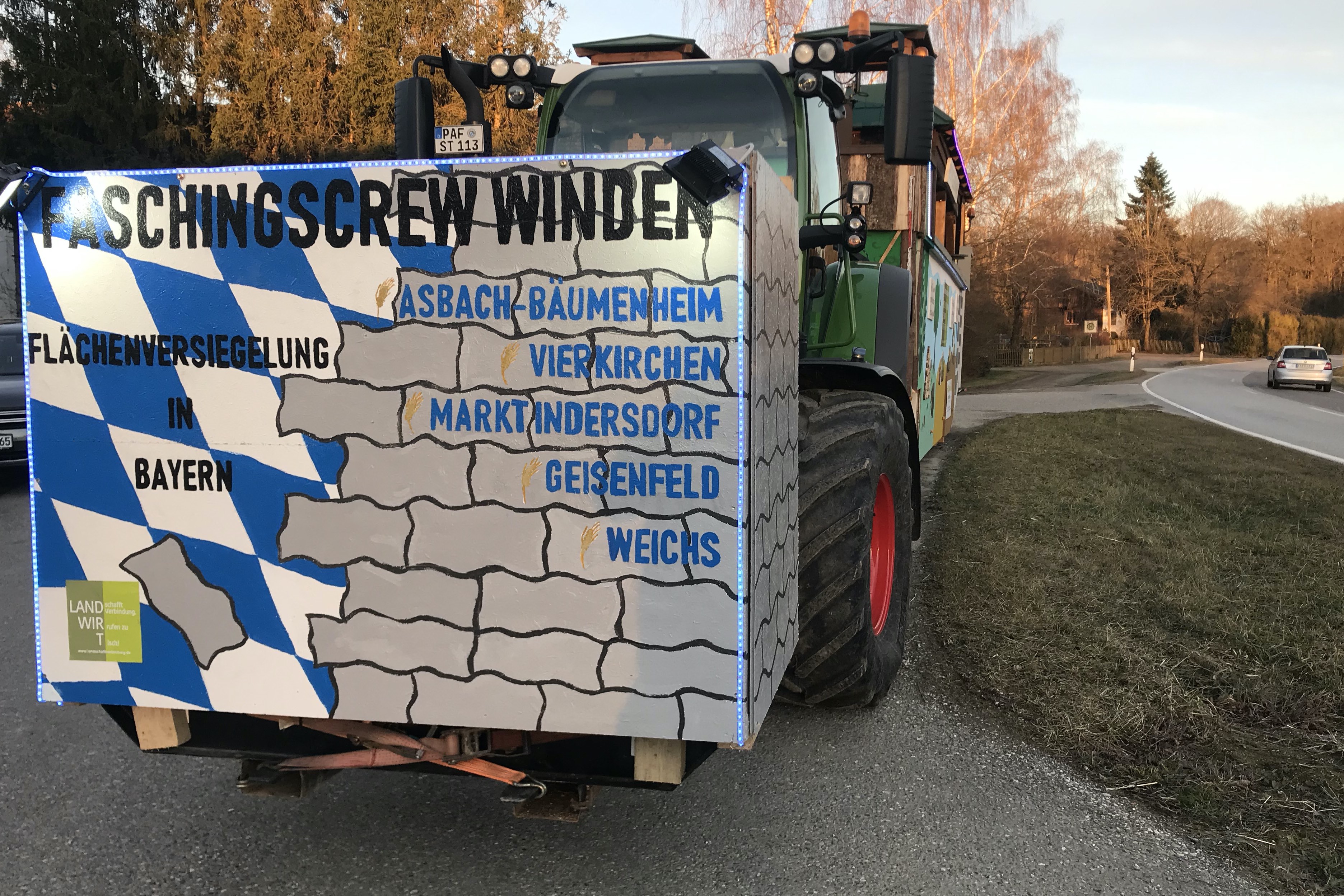 (ty) Mit "Supermario" im Jahr 2018 und der "Gummibären-Bande" im vergangenen Jahr hat die Clique von Männern und Frauen aus dem Hettshausener Ortsteil Winden zuletzt auf vergleichsweise neutrale Faschings-Slogans gesetzt. Heuer ist das ganz anders. Nun wird nämlich die Flächenversiegelung in Bayern aufs Korn genommen. "Wir wollten in diesem Jahr ein politisches Thema anschneiden, also was Eigenes, was sonst eher niemand hat", sagt Bernhard Schwarz, einer der Organisatoren, im Gespräch mit unserer Zeitung. "Außerdem brauchen wir keine billigen Wegwerf-Kostüme, das wäre Ressourcen-Verschwendung."