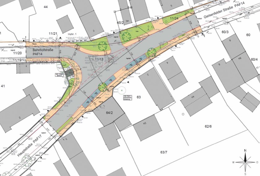 Als Alternative wäre laut Huber auch möglich, den Kurvenradius zu verändern, um den Verkehr der Hauptstraße besser im Blick zu haben. "Die Fraktionen des Gemeinderats werden in nächster Zeit die beiden Varianten diskutieren und ihre Vorstellungen zur Veränderung der Verkehrsführung mitteilen", so Huber. Eine Verkehrszählung ergab seinen Worten zufolge, dass an dem Knotenpunkt täglich mehr als 3000 Fahrzeuge – davon zehn Prozent Lkw – unterwegs seien. Die Grafik zeigt, wie die Alternativlösung zum Kreisverkehr in der Ortsmitte aussehen könnte (Grafik: Ingenieurbüro Goldbrunner)