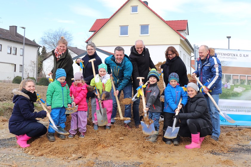Symbolischer Spatenstich im Baugebiet "Pfaffelleiten". Platz für drei Kindergarten- und zwei Kinderkrippen-Gruppen. Geplante Fertigstellung im Sommer 2021.