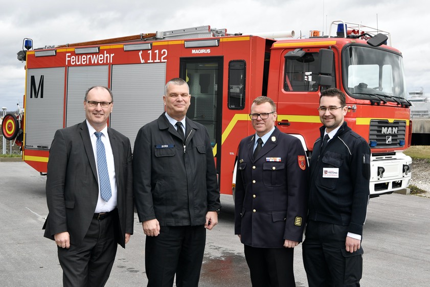 (ty) Neuer Einsatzort für ein 400 PS starkes Hilfslöschfahrzeug der Münchner Flughafen-Feuerwehr: Künftig ergänzt das Spezialfahrzeug den Fuhrpark der Branddirektion Freising. Zwischen den beiden Feuerwehren findet seit Jahren ein enger Austausch statt. Christian Huber, Leiter in Sachen Brandschutz, und Uwe Bork, Leiter der Flughafen-Feuerwehr der Flughafen-München-GmbH, übergaben das Fahrzeug an Manfred Danner, Kreisbrandrat Landkreis Freising, und Dominik Ternes, Sachbearbeiter Katastrophenschutz beim Landratsamt Freising (Foto oben). "Als verantwortungsvoller Nachbar unterstützt der Flughafen München seit über 25 Jahren gemeinnützige Einrichtungen, Vereine und Initiativen in der Region", lobt sich die Airport-GmbH selbst. (Foto: Alex Tino Friedel, FMG)