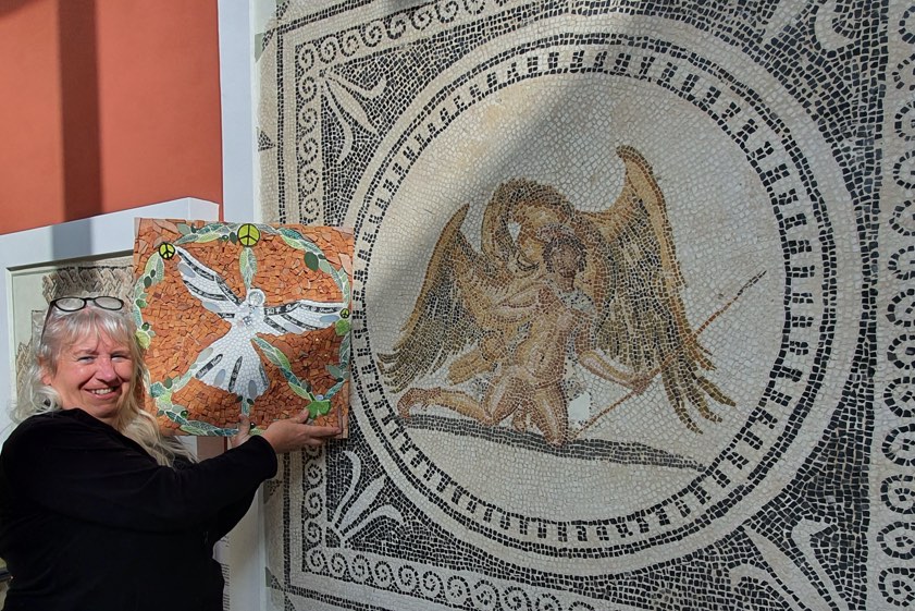 Die jüngste Künstlerin ist 22 Jahre alt und kam aus Italien, die mit 85 Jahren älteste Künstlerin kam aus Deutschland. "Wir arbeiteten in Sousse im Archäologischen Museum", berichtet Jung. "Wir konnten uns Tische in die Sonne ziehen und uns mitten in die malerischen alten Mauern platzieren, um an unseren Werken zu arbeiten." Die Reichertshofenerin hatte eine Taube vorbereitet, auf deren Schwingen in 20 Sprachen das Wort Frieden eingeritzt ist. "Viele sahen sie auch als Engel an, sie hat von beidem etwas." Eingerahmt ist das Werk von handgemachten Keramik-Blättern in Grüntönen, die das Peace-Zeichen darstellen sollen.