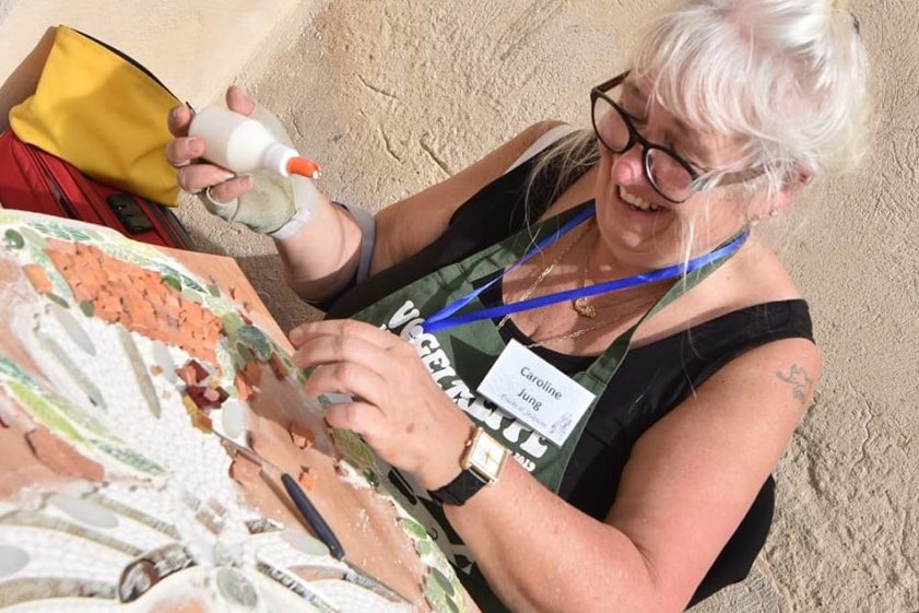 (ty) Aus Tunesien ist kürzlich die Reichertshofener Mosaik-Künstlerin Caroline Jung (Foto oben) zurückgekehrt. Dort war sie zusammen mit 49 Mosaik-Künstlern aus 21 Nationen, darunter auch Kollegen aus Chile, USA, Ägypten, Ukraine, Bahrein und Sudan. Sie alle waren aus dem gleichen Grund angereist: Es sollte dort ein "Friedens-Mosaik" entstehen (Foto unten).