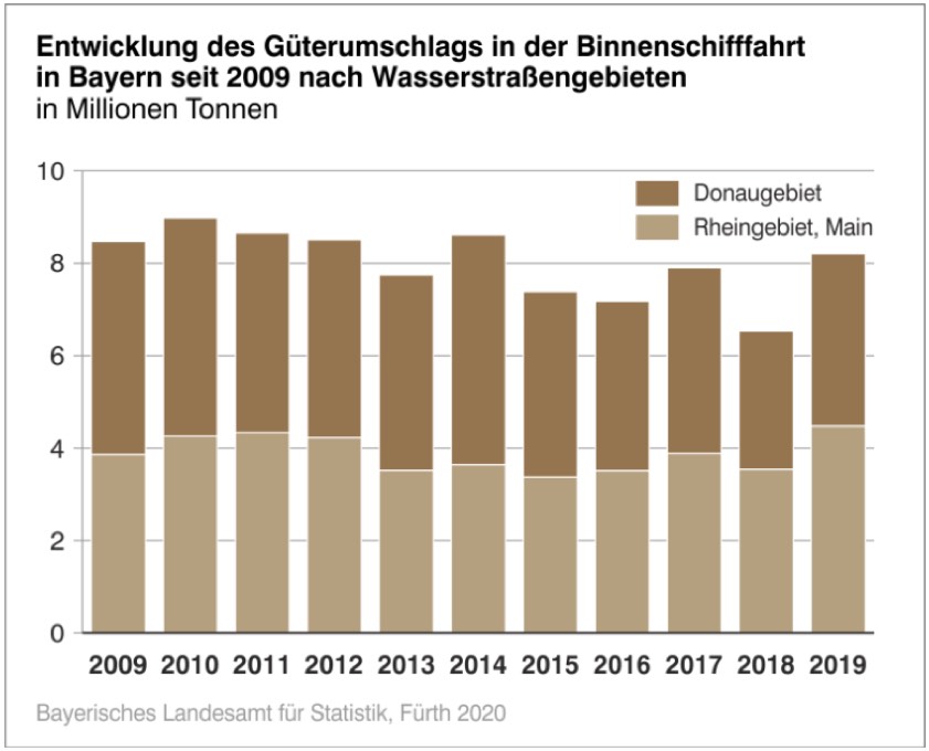 Auch an der Donau konnten die Vorjahreswerte übertroffen werden, und zwar um 24,6 Prozent auf 3,73 Millionen Tonnen. Im Zehnjahres-Vergleich erreichte dieser Wert allerdings nur einen Platz im unteren Drittel. Die umschlagstärksten Häfen waren Regensburg mit 1,39 Millionen und Aschaffenburg mit 0,73 Millionen Tonnen.