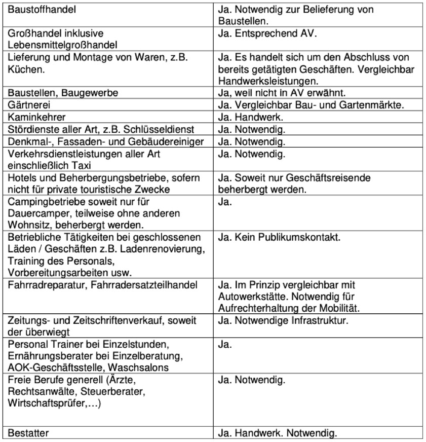 Den Übersichtsteil der Liste (Stand: 18. März, 16 Uhr) finden Sie als Screenshots am Ende dieses Beitrags. Die Liste ist auch abrufbar unter der Sonderseite "Informationen zum Corona-Virus" auf der Homepage des Landkreises unter www.landkreis-pfaffenhofen.de beziehungsweise direkt über diesem Link oder beim Kommunal-Unternehmen für Struktur-Entwicklung in Landkreis Pfaffenhofen (KUS) unter www.kus-pfaffenhofen.de/corona. Bei der Positivliste sei berücksichtigt, dass gemäß den Empfehlungen des Kabinett-Ausschusses der Bundesregierung zur Corona-Epidemie an die Bundesländer insbesondere Dienstleister und Handwerker generell weiter ihrer Tätigkeit nachgehen können sollen.