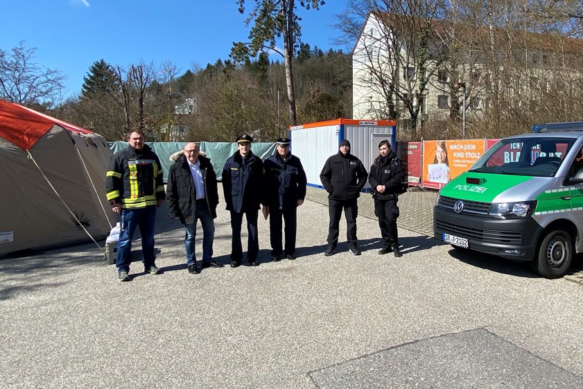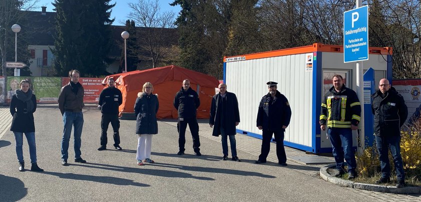 Am Abstrich-Zentrum in Mainburg: Medizin-Studentin Magdalena Bauer, Dr. Jakob Göttl, Manuela Winzer (Corona-Beauftragte), Landrat Martin Neumeyer, Vertreter der Mainburger Polizeiinspektion, Karl-Heinz Rott (Kreisbrandinspektor), Vertreter der Sicherheitsfirma.