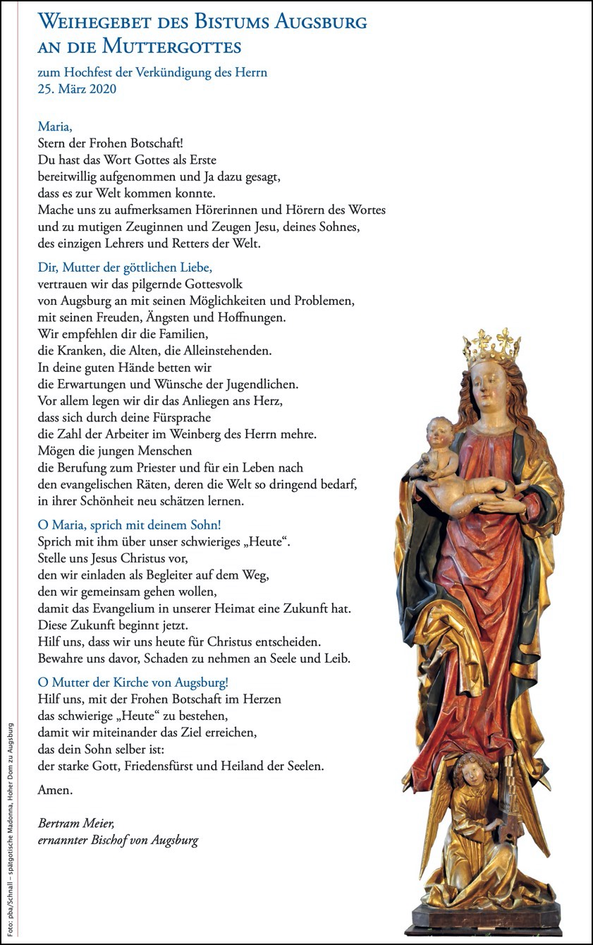 "Ich wurde zuletzt mehrmals darauf angesprochen, ob ich diesen sehr besonderen Schritt in dieser für uns alle schweren und ungewohnten Zeit tun könnte", erklärt der designierte künftige Oberhirte des Bistums von Augsburg, dessen Bischofsweihe wegen der Corona-Krise bekanntlich verschoben worden ist. "Diese Bitte greife ich am Hochfest der Verkündigung des Herrn gerne auf. Ich werde Maria, der Mutter der göttlichen Liebe, das pilgernde Gottesvolk von Augsburg mit all seinen Möglichkeiten und Problemen, mit seinen Freuden, Ängsten und Hoffnungen anvertrauen."