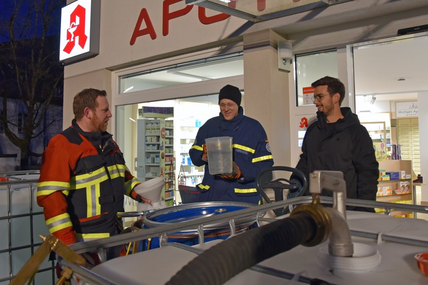 Unter fachkundiger Anleitung von Apotheker Daniel Schwinning mischten Einsatzkräfte von der Feuerwehr Moosburg und vom Freisinger THW den Angaben zufolge mit den notwendigen Gerätschaften Ethanol und destilliertes Wasser direkt vor der Michaeli-Apotheke. "Das dabei verwendete destillierte Wasser stellte der Forschungsreaktor München II der Technischen Universität München aus der eigenen Produktions-Anlage für Reinstwasser zur Verfügung", berichtet die Landkreis-Behörde. "Insgesamt stellten die Einsatzkräfte an dem Abend 930 Liter Flächen-Desinfektionsmittel her."