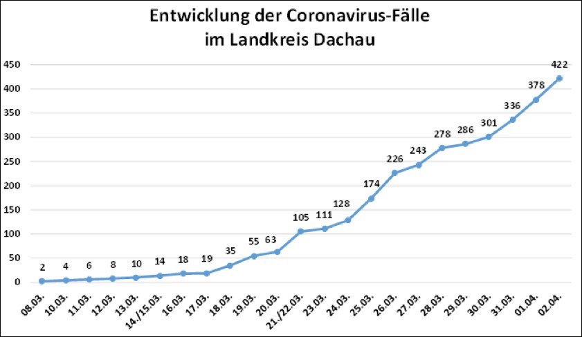 (ty) Am heutigen Mittwoch sind bis 17 Uhr weitere 44 Personen aus dem Kreis Dachau positiv auf den neuartigen Corona-Virus getestet worden. Damit erhöhte sich hier nach Angaben des Landratsamts die Zahl der bestätigten Infektionen auf insgesamt 422 (siehe Grafik unten). "Leider sind zwei weitere Personen aus unserem Landkreis am Corona-Virus verstorben", erklärte die Behörde. Die ums Leben gekommenen Menschen seien 77 und 88 Jahre alt gewesen. Vor dem Hintergrund der sonnigen Wetter-Aussichten fürs Wochenende appellierte Landrat Stefan Löwl, die Ausgangs-Beschränkungen zu beachten.