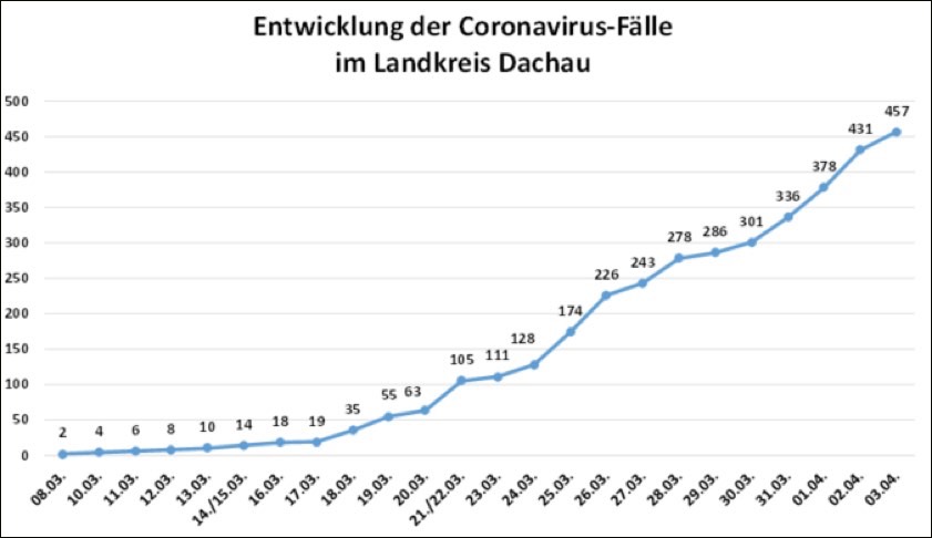 Am gestrigen Freitag waren bis 17 Uhr weitere 35 Personen aus dem Landkreis Dachau positiv auf den neuartigen Virus getestet worden, wie das Landratsamt am gestrigen Abend erklärte. Damit erhöhte sich die Zahl der Corona-Fälle im Kreis Dachau auf insgesamt 457 (siehe Grafik unten).