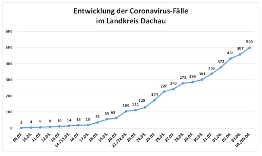 (ty) Bis zum heutigen Nachmittag, 17 Uhr, sind weitere 47 Personen aus dem Kreis Dachau positiv auf den neuartigen Corona-Virus getestet worden. Das wurde aus dem Landratsamt gemeldet. Insgesamt erhöht sich damit die Anzahl der hier Infizierten auf jetzt 500. "Leider sind seit Freitagabend weitere zwei Personen aus dem Landkreis am Corona-Virus verstorben", heißt es weiter. Das am Freitag "wegen nicht nachvollziehbarer Infektionsketten" geschlossene Dachauer Klinikum kann seinen Betrieb offenbar wieder aufnehmen.