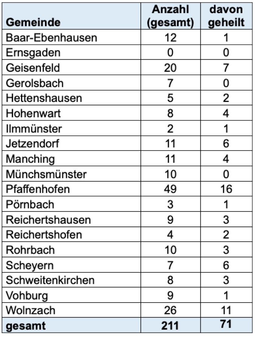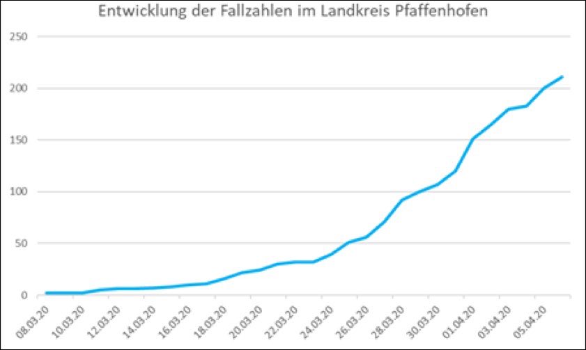 Die Zahl der mit dem neuartigen Corona-Virus infizierten Personen aus dem Kreis Pfaffenhofen, die mittlerweile als geheilt gelten, ist nach Angaben des Landratsamts um 29 auf jetzt insgesamt 71 gestiegen. Insgesamt seien bisher vier mit dem Virus infizierte Landkreis-Bewohner "auch zum Teil aufgrund von bestehenden Vorerkrankungen" ums Leben gekommen. Die Zahl der infizierten und noch nicht geheilten Landkreis-Bürger betrage demnach aktuell 136. Wie sich die Zahl der im Kreis Pfaffenhofen bestätigten Corona-Fälle entwickelt hat, veranschaulicht die nachfolgende Grafik.