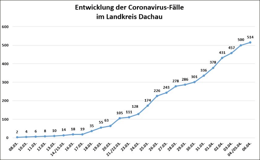 (ty) Heute sind bis 17 Uhr weitere 14 Personen aus dem Kreis Dachau positiv auf den neuartigen Corona-Virus getestet worden. Das wurde aus dem Landratsamt gemeldet. Damit steigt die Zahl der bestätigten Infektionen auf 514. "Leider sind uns seit unserer Pressemitteilung am gestrigen Sonntag weitere drei Todesfälle aus dem Landkreis gemeldet worden, die mit dem Corona-Virus infiziert waren", heißt es weiter. "Wir sprechen den Angehörigen unser tief empfundenes Beileid aus." Die Zahl der in Zusammenhang mit der Pandemie ums Leben gekommenen Menschen aus dem Kreis Dachau erhöht sich somit auf neun.