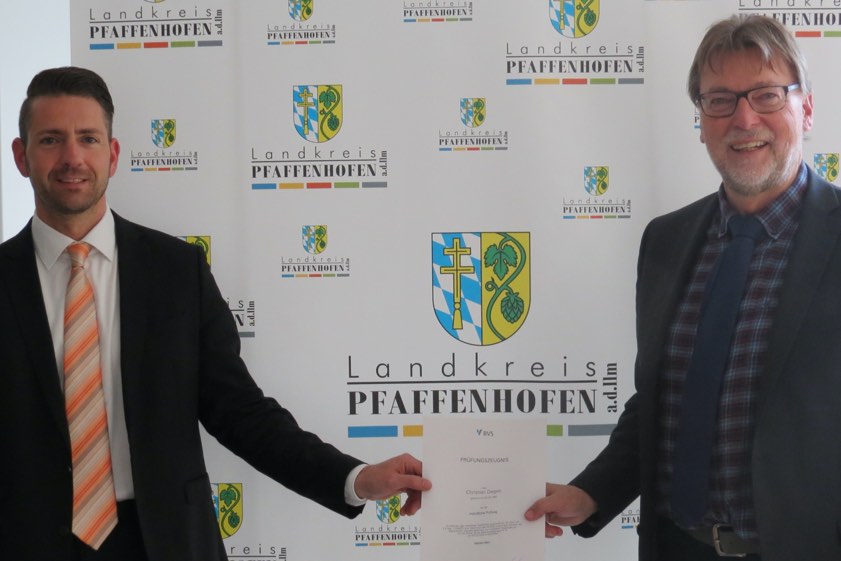 (ty) Der Pfaffenhofener Landrat Martin Wolf hat seinem Behörden-Mitarbeiter Christian Degen zur bestandenen Prüfung im Rahmen des Aufstiegs zur Qualifikations-Ebene vier – früher: höherer Dienst – gratuliert (Foto oben). "Inhalte dieser Weiterbildung, auch modulare Qualifizierung genannt, sind sowohl fachliche als auch überfachliche Schwerpunkte", wurde dazu aus dem Landratsamt erklärt.