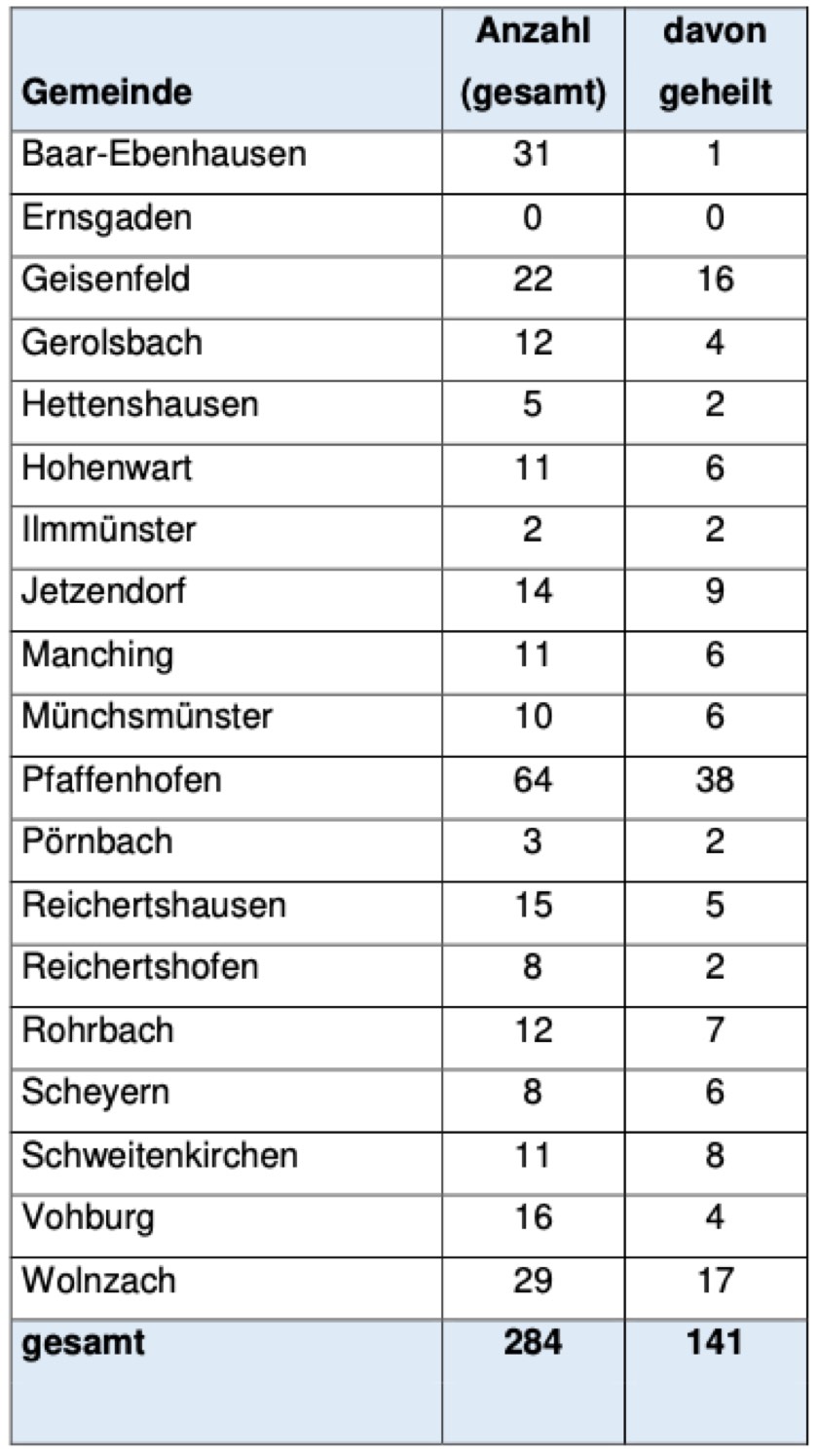 Von den insgesamt 284 Menschen aus dem Landkreis Pfaffenhofen, bei denen eine Corona-Infektion bestätigt worden ist, gelten laut aktueller Mitteilung der Behörde mittlerweile 141 als genesen – das sind 15 Personen mehr als noch gestern. Die Zahl der Infizierten und noch nicht geheilten Landkreis-Bürger beträgt demnach laut heutigem Stand 131 (gestern: 137) und liegt damit erstmals unter der Zahl der Genesenen. Die Zahl der insgesamt ermittelten Kontakt-Personen hat sich auf jetzt 1052 erhöht, wie das Landratsamt ebenfalls am heutigen Nachmittag mitteilte.