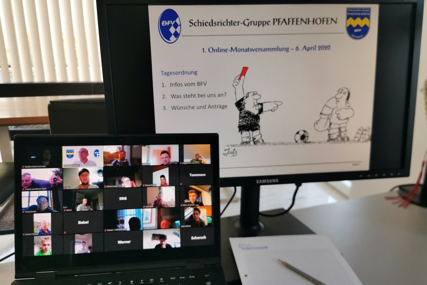 (ty) Um für den weiteren Fußball-Spielbetrieb nach der Zwangspause durch die Corona-Virus-Krise bestmöglich gerüstet zu sein, hat die Schiedsrichter-Gruppe von Pfaffenhofen nun erstmals eine Monats-Versammlung online abgehalten. Mehr als 60 aktive Unparteiische nahmen an der Web-Konferenz teil, wie Obmann Wolfgang Inderwies heute berichtete (siehe auch Foto unten). Er erläuterte bei der "Zusammenkunft" mögliche Szenarien, die der bayerische Fußball-Verband (BFV) entwickelt habe, und gab einen Ausblick bezüglich der Neuorganisation der Aktivitäten in der hiesigen Schiri-Gruppe.