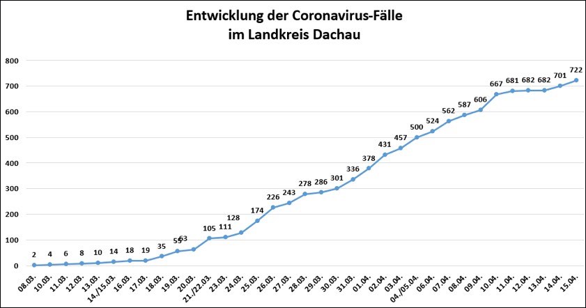 (ty) In Zusammenhang mit der Corona-Pandemie gibt es im Kreis Dachau weitere Menschenleben zu beklagen. Laut heutiger Mitteilung des Landratsamts sind seit gestern drei Personen im Alter von 60, 61 und 75 Jahren gestorben, die mit dem Virus infiziert waren. Damit erhöht sich die Anzahl der Corona-Todesfälle in diesem Kreis auf nunmehr 17. Heute sind nach Behörden-Angaben weitere 25 Landkreis-Bürger positiv auf den neuartigen Erreger getestet worden. Die Zahl der bestätigten Infektionen steigt damit hier auf 722. Mittlerweile gelten 467 Infizierte als geheilt.