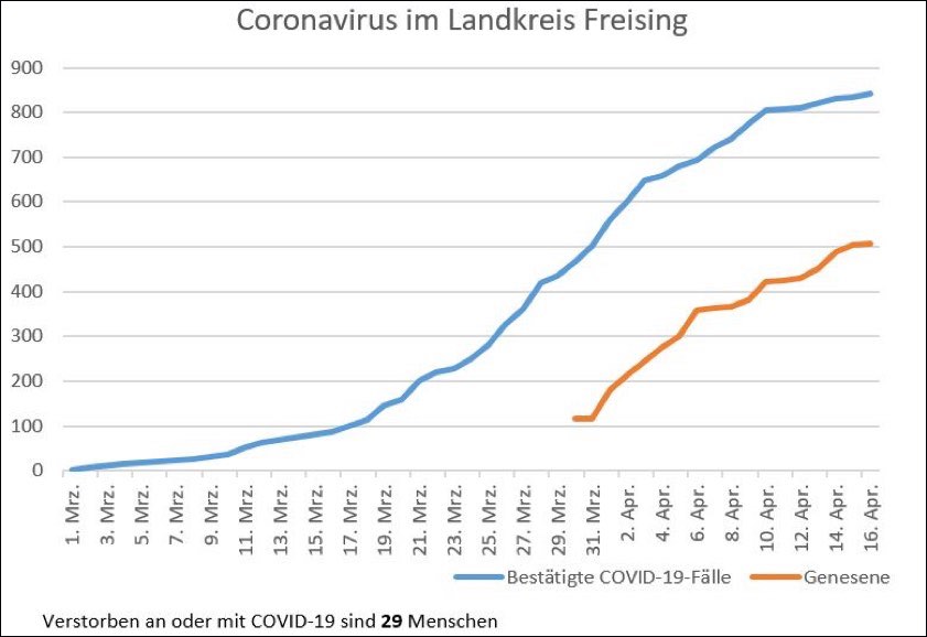 Im Landkreis Freising sind laut heutiger Mitteilung mittlerweile 843 Corona-Fälle nachgewiesen, 508 der mit dem neuartigen Virus infizierten Menschen gelten bereit als genesen. 29 Menschen sind an oder mit dem Virus gestorben. Alle im Klinikum gestorbenen Corona-Patienten waren über 75 Jahre alt, berichtete der ärztliche Direktor Markus Neumaier. Dort sei die Lage weiterhin stabil – mit 50 bis 60 mittelschwer bis schwer erkrankten Patienten, von denen elf auf der Intensivstation liegen und sieben beatmet werden. "Es sind auch Jüngere darunter, die eine Beatmung brauchen", so Neumaier. "Die haben allerdings die besten Karten im Hinblick auf eine Genesung."