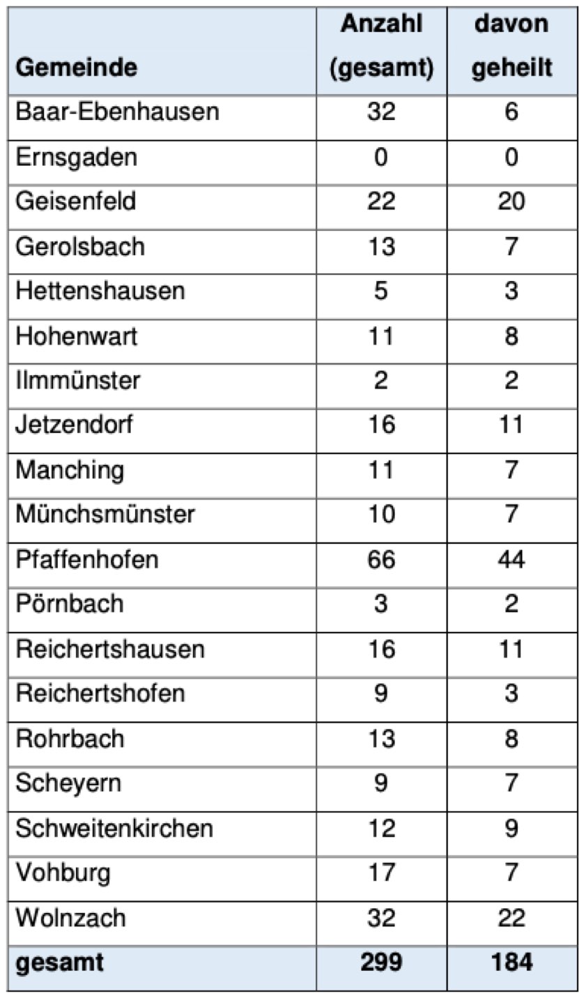 (ty) Im Zusammenhang mit der Corona-Pandemie gibt es im Kreis Pfaffenhofen zum Glück seit mittlerweile sechs Tagen kein weiteres Menschenleben zu beklagen. Wie berichtet, sind aber bislang insgesamt zwölf Personen aus dem Landkreis, die positiv auf das neuartige Virus getestet worden waren, gestorben. Die Zahl der bestätigten Infizierten hat sich hier seit gestern um drei Corona-Patienten erhöht und beträgt nunmehr 299. Wie stark welche Landkreis-Gemeinde betroffen ist, zeigt die tabellarische Aufstellung am Ende dieses Artikels. Das Bürger-Telefon des Landratsamts ist auch an diesem Wochenende erreichbar.