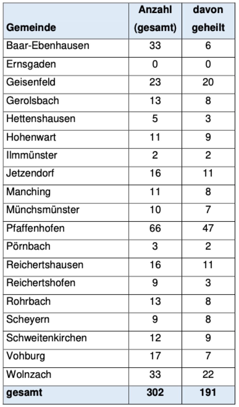 (ty) Im Zusammenhang mit der Corona-Pandemie gibt es im Kreis Pfaffenhofen ein weiteres Menschenleben zu beklagen. Wie das Landratsamt heute mitteilte, ist eine mit dem Virus infizierte 84-jährige Frau in einem Krankenhaus gestorben. Damit sind bislang insgesamt 13 Personen aus dem Landkreis, die positiv auf den neuartigen Erreger getestet worden waren, ums Leben gekommen. Die Zahl der bestätigten Infizierten hat sich hier seit gestern um drei Corona-Patienten erhöht und beträgt nunmehr 302. Wie stark welche Landkreis-Gemeinde betroffen ist, zeigt die tabellarische Aufstellung am Ende dieses Artikels.