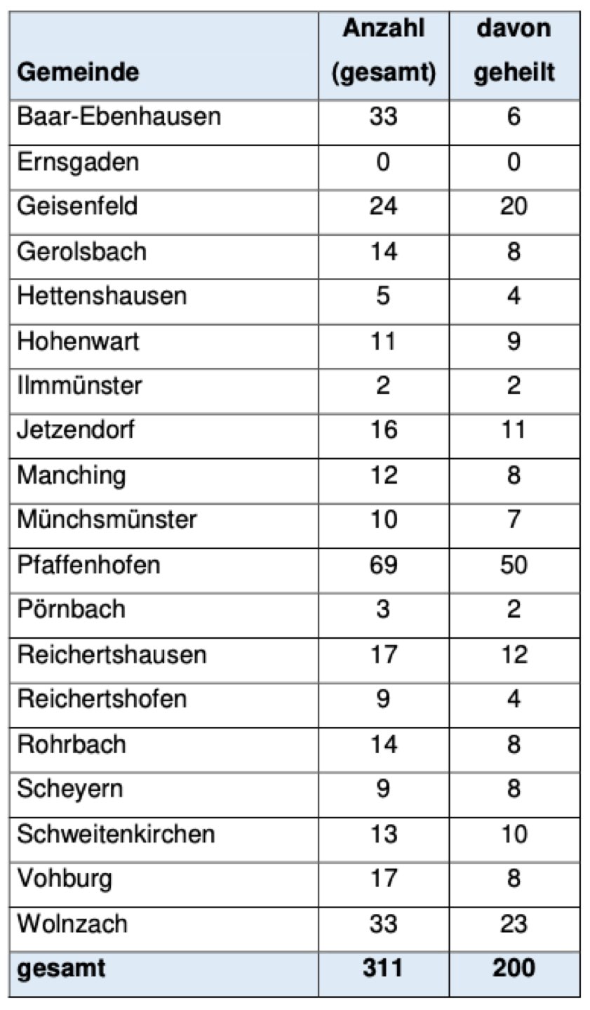 (ty) Im Zusammenhang mit der Corona-Pandemie gibt es im Kreis Pfaffenhofen zum Glück seit vorgestern kein weiteres Menschenleben zu beklagen. Wie berichtet, sind bislang insgesamt 16 Personen aus dem Landkreis, die positiv auf den neuartigen Erreger getestet worden waren, ums Leben gekommen. Die Zahl der bestätigten Infizierten hat sich hier seit gestern um zwei Corona-Patienten erhöht und beträgt nunmehr 311. Wie stark welche Landkreis-Gemeinde betroffen ist, zeigt die aktuelle tabellarische Aufstellung am Ende dieses Artikels.
