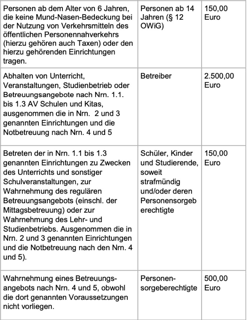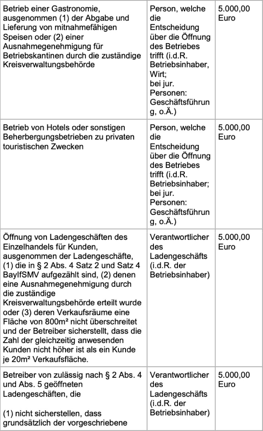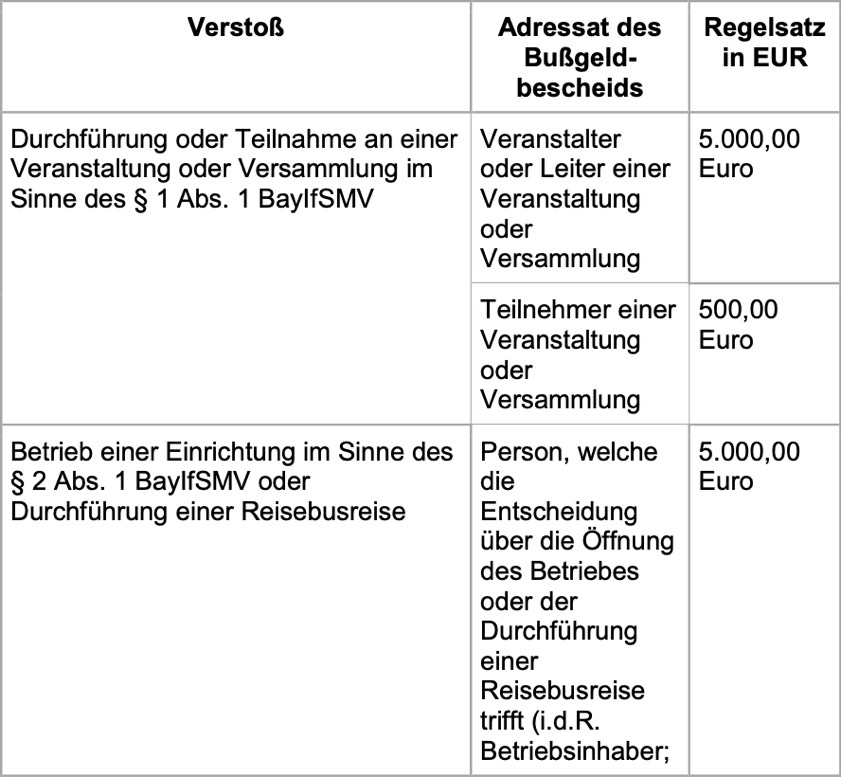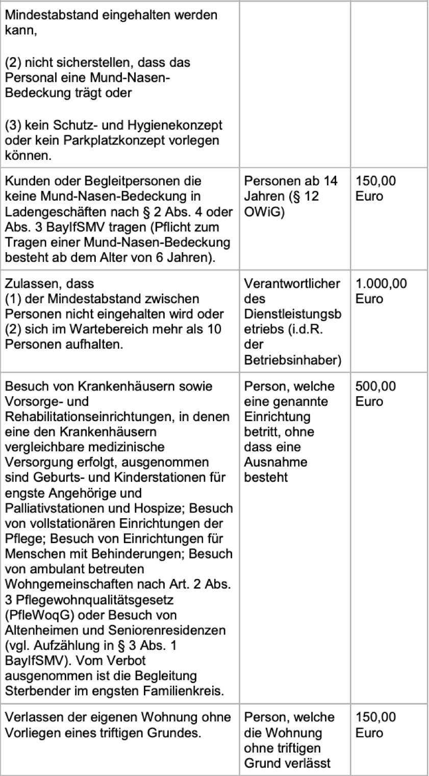 Der erweiterte Bußgeld-Katalog bei Verstößen gegen die Regelungen zur Eindämmung des Corona-Virus stehe allen Kreisverwaltungs-Behörden im Freistaat als Richtschnur zur Verfügung. Diese seien für den Erlass der einschlägigen Bußgeld-Bescheide zuständig. Die bayerische Polizei sei ebenfalls informiert. Antworten zu wichtigen Fragen in Zusammenhang mit Mund-Nasen-Masken gibt es auf der Internet-Seite des bayerischen Ministeriums für Gesundheit und Pflege; hier der direkte Link. Nachfolgend einen Auszug aus dem Bußgeld-Katalog in der Übersicht, die vollständigen Infos dazu finden Sie unter diesem Link.