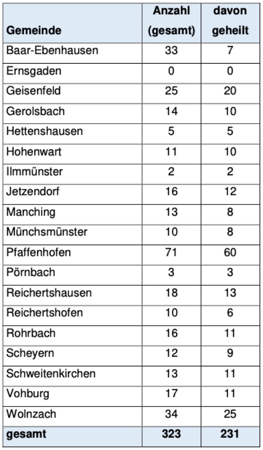 (ty) Im Zusammenhang mit der Corona-Pandemie gibt es im Kreis Pfaffenhofen zum Glück seit vorgestern kein weiteres Menschenleben zu beklagen. Bislang sind, wie berichtet, insgesamt 17 Personen aus dem Landkreis, die positiv auf den neuartigen Erreger getestet worden waren, ums Leben gekommen. Die Zahl der bestätigten Infizierten hat sich hier seit gestern um drei Corona-Patienten erhöht und beträgt nunmehr 323. Wie stark welche Landkreis-Gemeinde betroffen ist, zeigt die aktuelle tabellarische Aufstellung am Ende dieses Artikels.