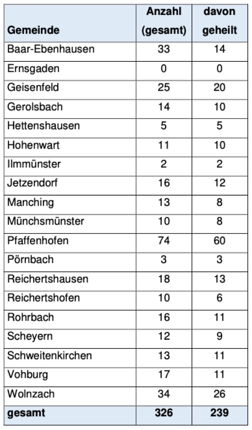 (ty) Im Zusammenhang mit der Corona-Pandemie gibt es im Kreis Pfaffenhofen zum Glück seit drei Tagen kein weiteres Menschenleben zu beklagen. Bislang sind, wie berichtet, insgesamt 17 Personen aus dem Landkreis, die positiv auf den neuartigen Erreger getestet worden waren, ums Leben gekommen. Die Zahl der bestätigten Infizierten hat sich hier seit gestern um drei Corona-Patienten erhöht und beträgt nunmehr 326. Wie stark welche Landkreis-Gemeinde betroffen ist, zeigt die aktuelle tabellarische Aufstellung am Ende dieses Artikels.