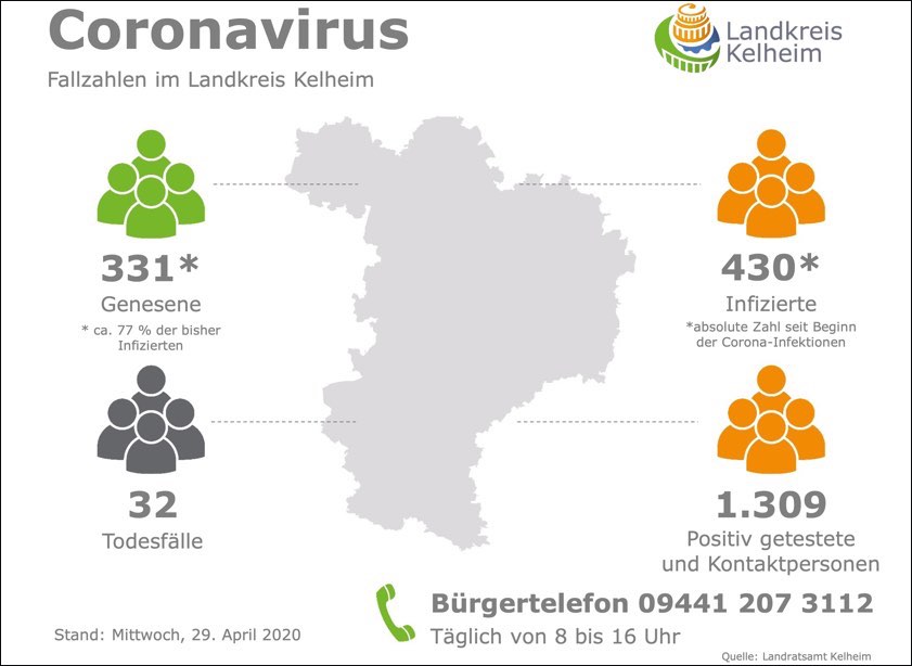 (ty) Im Kreis Kelheim gibt es in Zusammenhang mit der Corona-Pandemie ein weiteres Menschenleben zu beklagen. Wie heute aus dem Landratsamt gemeldet wurde, steigt damit die Zahl der mit dem neuartigen Erreger infizierten Landkreis-Bürger, die gestorben sind, auf 32. Die Zahl der bestätigten Corona-Fälle hat sich indes minimal erhöht. Unter Verweis auf Daten des Gesundheitsamt teilte die Behörde mit, dass – Stand heute, 0 Uhr – die Zahl der im Kreis Kelheim positiv auf das neuartige Virus getesteten Menschen seit gestern um einen auf nunmehr 430 gestiegen ist. 331 hiesige Corona-Patienten – fünf mehr als gestern – gelten mittlerweile als genesen und sind aus der Quarantäne entlassen.