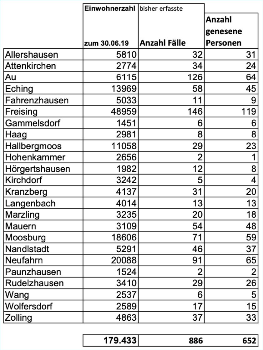 "Mittlerweile ist die Ausbreitung des Corona-Virus im Landkreis Freising so weit fortgeschritten, dass der Landkreis die Gefahr einer möglichen Diskriminierung von Bürgern nicht mehr als so akut einstuft", wurde am heutigen Nachmittag aus dem Landratsamt erklärt. Aus diesem Grund werden der Ankündigung zufolge "die Fallzahlen einmal wöchentlich auf die Gemeinden aufgeschlüsselt" veröffentlicht.
