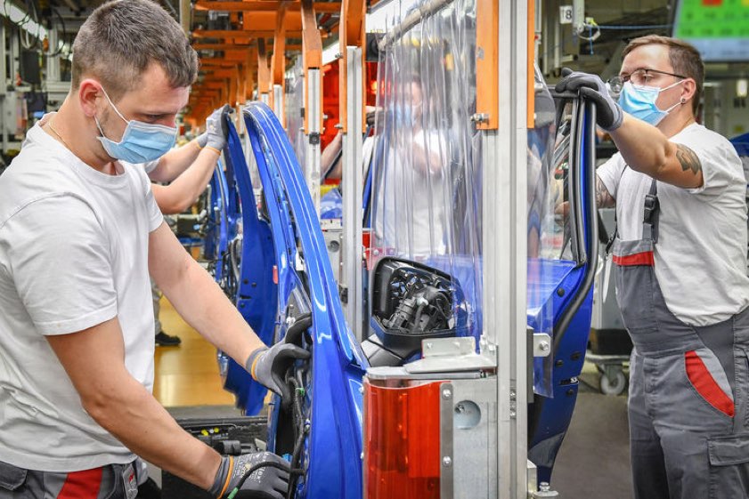 Das Foto zeigt einen Ausschnitt der Montage-Linie in Ingolstadt mit einer Sicherheits-Trennfolie, auf der die Mitarbeiter zunächst einschichtig den A3 und Q2 produzieren.