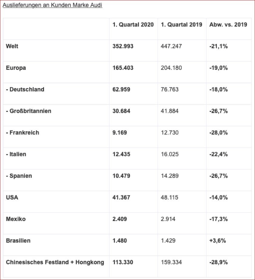Nachdem Audi zunächst mit Rückenwind aus seiner Modell-Offensive ins Jahr gestartet war, wirkten sich die Ausbreitung des Corona-Virus und damit zusammenhängende regulatorische Maßnahmen wie das Schließen der Händler-Betriebe und Ausgangs-Beschränkungen ab Februar zunächst im chinesischen Markt, später auch in den anderen Kernregionen zunehmend negativ auf die Auslieferungen aus. Pandemiebedingt sanken die Auslieferungen von Audi in den ersten drei Monaten des Jahres um 21,1 Prozent auf 352 993 Autos (Vorjahres-Zeitraum: 447 247).