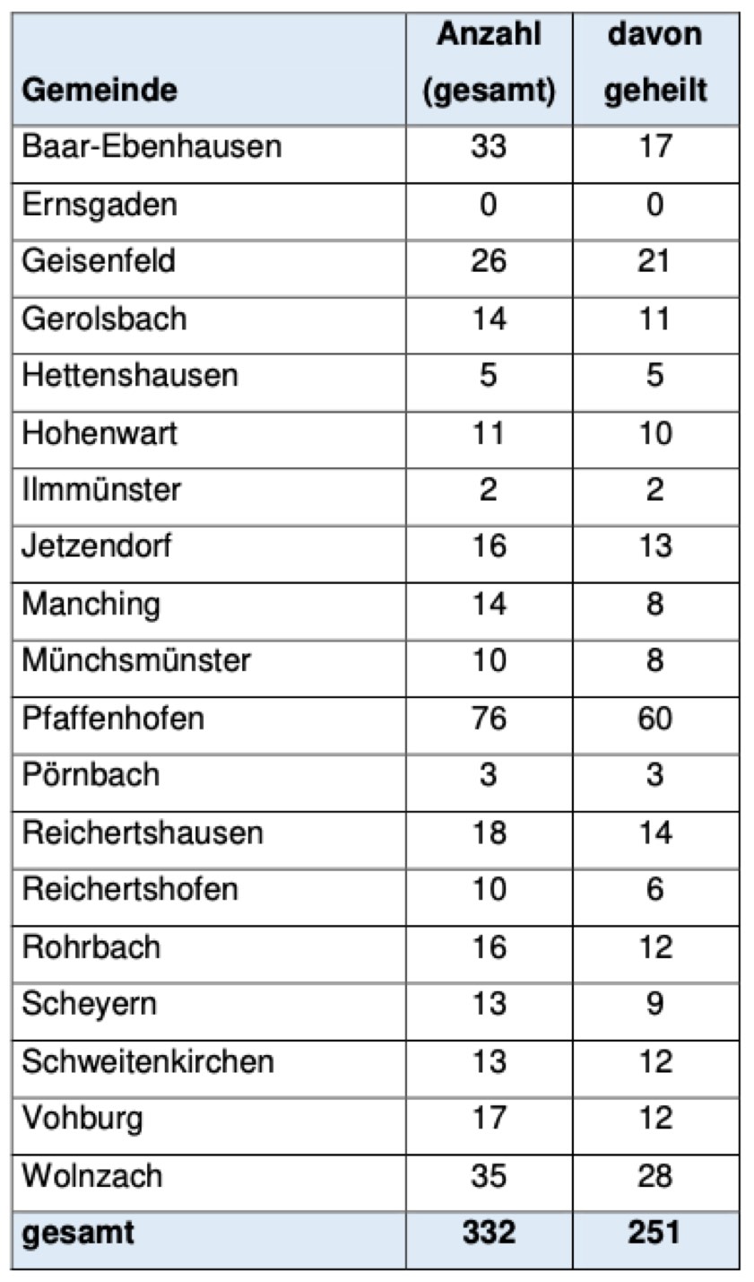 (ty) Im Zusammenhang mit der Corona-Pandemie gibt es im Kreis Pfaffenhofen zum Glück seit nunmehr sechs Tagen kein weiteres Menschenleben zu beklagen. Bislang sind, wie berichtet, insgesamt 17 Personen aus dem Landkreis, die positiv auf den neuartigen Erreger getestet worden waren, ums Leben gekommen. Die Zahl der bestätigten Infizierten hat sich indes seit gestern um zwei Corona-Patienten erhöht und beträgt nunmehr 332. Wie stark welche Landkreis-Gemeinde betroffen ist, zeigt die tagesaktuelle tabellarische Aufstellung am Ende dieses Artikels.