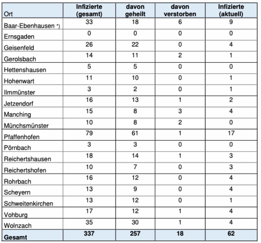 (ty) Im Zusammenhang mit der Corona-Pandemie gibt es im Kreis Pfaffenhofen, wie berichtet, bislang 18 Menschenleben zu beklagen. Das Landratsamt veröffentlichte heute erstmals auch eine Übersicht darüber, in welchen Gemeinden die mit dem Virus infizierten Menschen, die gestorben sind, gelebt haben. Die Zahl der bestätigten Infizierten hat sich im Kreis seit gestern um zwei Corona-Patienten erhöht und beträgt nunmehr 337. Wie stark welche Landkreis-Gemeinde betroffen ist, zeigt die aktuelle tabellarische Aufstellung am Ende dieses Artikels ebenfalls.