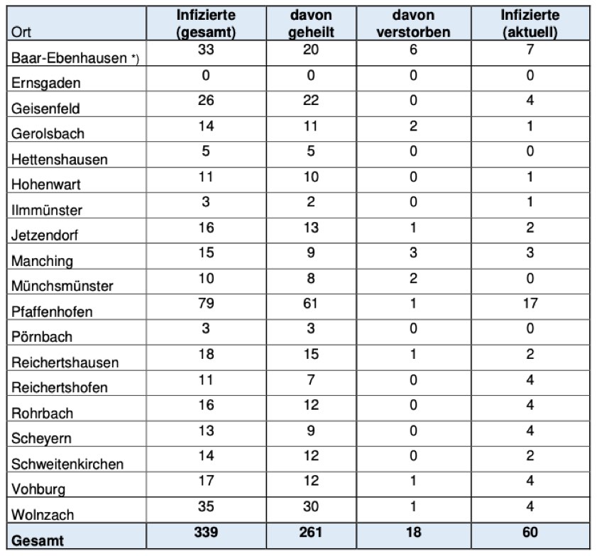 (ty) Im Zusammenhang mit der Corona-Pandemie gibt es im Kreis Pfaffenhofen, wie berichtet, bislang 18 Menschenleben zu beklagen. Das Landratsamt veröffentlicht seit gestern auch eine Übersicht darüber, in welchen Gemeinden die mit dem Virus infizierten Menschen, die gestorben sind, gelebt haben. Die Zahl der bestätigten Infizierten hat sich im Kreis seit gestern um zwei Corona-Patienten erhöht und beträgt nunmehr 339. Wie stark welche Landkreis-Gemeinde betroffen ist, zeigt die aktuelle tabellarische Aufstellung am Ende dieses Artikels ebenfalls.