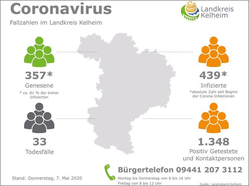 (ty) Im Kreis Kelheim gibt es in Zusammenhang mit der Corona-Pandemie seit gestern ein weiteres Menschenleben zu beklagen. Damit sind hier nach Angaben des Landratsamts bislang 33 Personen, die mit dem Virus infiziert waren, ums Leben gekommen. Die Zahl der bestätigten Corona-Fälle hat sich seit gestern nicht erhöht. Unter Verweis auf Daten des Gesundheitsamt teilte das Landratsamt mit, dass – Stand heute, 7. Mai, 0 Uhr – die Zahl der im Kreis Kelheim positiv auf das neuartige Virus getesteten Menschen bei 439 liegt. 357 hiesige Corona-Patienten – einer mehr als gestern – gelten mittlerweile als genesen und sind aus der Quarantäne entlassen. "Das heißt: Zirka 81 Prozent der bisher Infizierten sind bereits wieder gesund", erklärt die Behörde.
