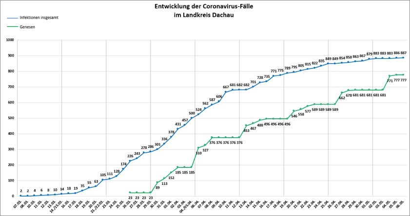 (ty) Im Kreis Dachau hat das Corona-Virus ein weiteres Menschenleben gefordert. Nach Angaben des Landratsamts ist zuletzt eine Person im Alter von 94 Jahren gestorben, die mit dem Erreger infiziert war. Damit erhöht sich die Zahl der infizierten Landkreis-Bürger, die ums Leben gekommen sind, auf nunmehr 26. Insgesamt sind bislang (Stand: heute, 17 Uhr) 887 Menschen aus dem Kreis positiv auf das neuartige Virus getestet worden; davon konnten bis gestern 777 die Quarantäne bereits wieder verlassen und gelten als genesen (siehe auch Grafik unten).