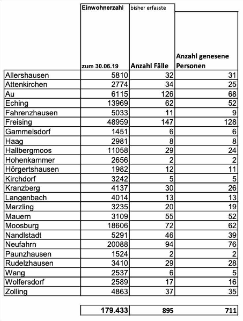 Der unten stehenden, vom Landratsamt herausgegeben Tabelle ist zu entnehmen, wie viele Personen aus welcher Kommune im Landkreis Freising kumulativ seit dem 29. Februar dieses Jahres positiv auf das Corona-Virus getestet worden sind und wie viele davon als genesen gelten. Die Behörde weist darauf hin, dass die Summe nicht der aktuellen Gesamtzahl für den Landkreis entspricht. Am Freitagvormittag wird bei einer Pressekonferenz am Landratsamt über die Maßnahmen zur weiteren Ausdehnung des Schulbetriebs sowie über aktuelle Entwicklungen in Klinikum und Gesundheitsamt informiert.