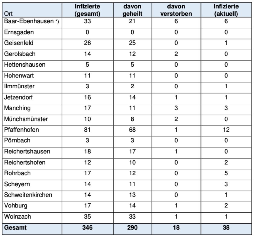 (ty) Im Zusammenhang mit der Corona-Pandemie gibt es im Kreis Pfaffenhofen, wie berichtet, bislang 18 Menschenleben zu beklagen. Das Landratsamt veröffentlicht seit dieser Woche eine Übersicht darüber, in welchen Gemeinden die mit dem Virus infizierten Menschen, die gestorben sind, gelebt haben. Die Zahl der bestätigten Infizierten hat sich im Kreis seit gestern um einen Corona-Patienten erhöht und beträgt nunmehr 346. Wie stark welche Landkreis-Gemeinde betroffen ist, zeigt die aktuelle tabellarische Aufstellung in diesem Artikel ebenfalls.