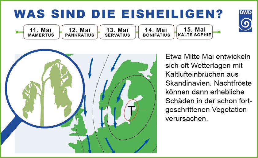 Die Namen der Eisheiligen beziehen sich auf frühchristlicher Bischöfe und Märtyrer. In Norddeutschland gelten vor allem die Tage vom 11. bis 13. Mai als Eisheilige (Mamertus, Pankratius und Servatius). Im Süden und Südosten Deutschlands zählen noch der 14. (Bonifatius) und der 15. Mai (kalte Sofia) dazu. Dort ist dann der 11. Mai nicht gültig. "Die eintägige Differenz entsteht, weil die Kaltluft bei Eintritt der Nordwetterlagen rund 24 Stunden benötigt, um von der Küste bis zu den Alpen vorzudringen", erklärt der DWD. "Ein Kaltluft-Einbruch im Mai kann in ungünstigen Lagen oder auch im Alpenvorland durchaus noch mal Frost bringen." Vor allem Gärtner und Winzer fürchten die Schäden an jungen Kulturen, die oft schon bei geringen Kältegraden eintreten können.