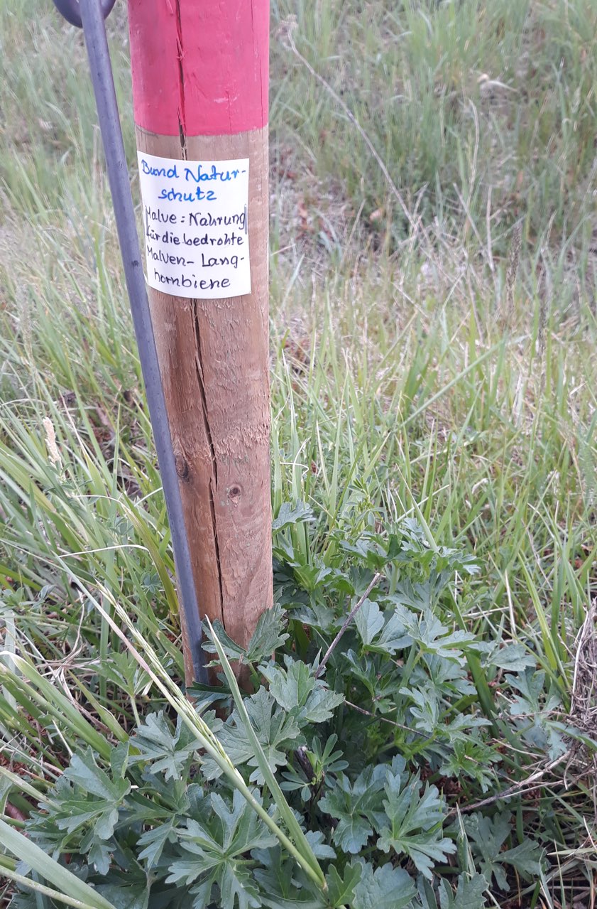 Malve mit beschriftetem Pflock, der die unscheinbare Pflanze vor dem Mäher schützen und gleichzeitig Spaziergänger über ihre Bestäuberin, die Malven-Langhornbiene, informieren soll.