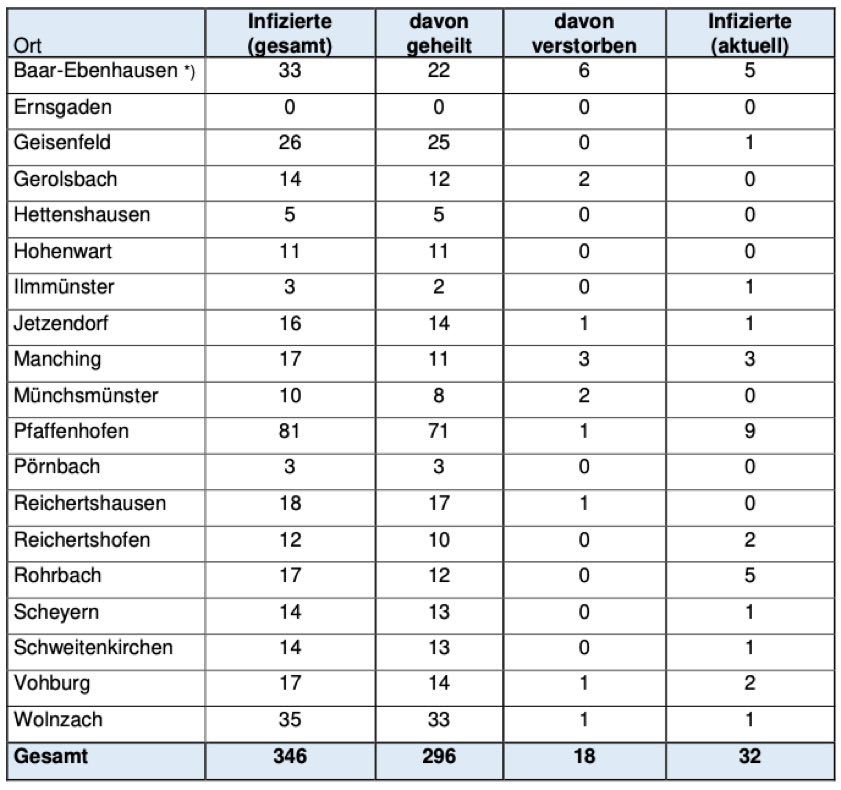 (ty) Im Zusammenhang mit der Corona-Pandemie gibt es im Kreis Pfaffenhofen, wie berichtet, bislang 18 Menschenleben zu beklagen. Das Landratsamt veröffentlicht seit vergangener Woche auch eine tägliche Übersicht darüber, in welchen Gemeinden die mit dem Virus infizierten Menschen, die gestorben sind, gelebt haben. Die Zahl der bestätigten Infizierten hat sich im Kreis seit gestern nicht erhöht und beträgt damit weiterhin 346. Wie stark welche Landkreis-Gemeinde betroffen ist, zeigt die aktuelle tabellarische Aufstellung in diesem Artikel ebenfalls – aktuell sind sieben der 19 Kommunen sozusagen corona-frei.