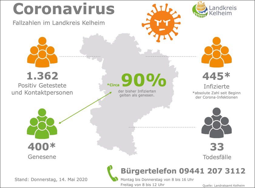 (ty) Im Kreis Kelheim gibt es, wie berichtet, in Zusammenhang mit der Corona-Pandemie bislang 33 Menschenleben zu beklagen. Die Zahl der bestätigten Corona-Fälle hatte sich zuletzt fünf Tage lang nicht weiter erhöht. Nun stieg sie um vier. Unter Verweis auf Daten des Gesundheitsamt teilte das Landratsamt mit, dass – Stand heute, 0 Uhr – die Zahl der im Kreis Kelheim positiv auf das neuartige Virus getesteten Menschen bei 445 liegt. 400 hiesige Corona-Patienten – acht mehr als gestern – gelten mittlerweile als genesen und sind aus der Quarantäne entlassen. "Das heißt: Zirka 90 Prozent der bisher Infizierten sind bereits wieder gesund", erklärt die Behörde.