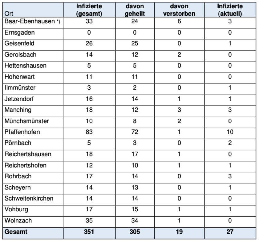 Wie viele Menschen aus welcher Landkreis-Gemeinde bislang positiv auf das Corona-Virus getestet worden sind, können Sie der tabellarischen Aufstellung in diesem Beitrag entnehmen, die auch heute wieder vom Pfaffenhofener Landratsamt herausgegeben worden ist. "Aufgrund der mittlerweile erhöhten Zahl der Infektionen ist ein unmittelbarer Zusammenhang zu einzelnen infizierten Personen nicht mehr herstellbar", erklärte die Behörde dazu. "Die Persönlichkeitsrechte der Betroffenen sind daher weiterhin geschützt."