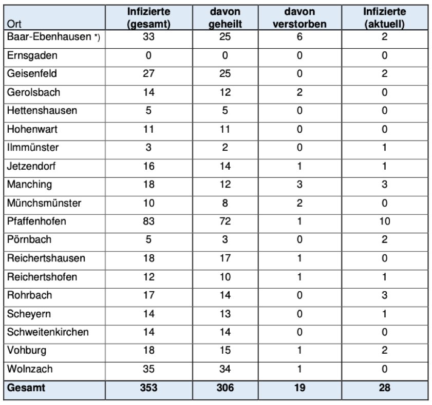 (ty) Im Zusammenhang mit der Corona-Pandemie gibt es im Kreis Pfaffenhofen, wie berichtet, bislang 19 Menschenleben zu beklagen. Das Landratsamt veröffentlicht seit vergangener Woche eine tägliche Übersicht (siehe unten) darüber, in welchen Gemeinden die mit dem Virus infizierten Menschen, die gestorben sind, gelebt haben beziehungsweise wie viele bestätigte Infektionsfälle und genesene Patienten es in welcher Kommune gibt. Die Zahl der Landkreis-Bürger, die positiv auf den neuartigen Erreger getestet worden sind, hat sich seit gestern um zwei auf nunmehr 353 erhöht.