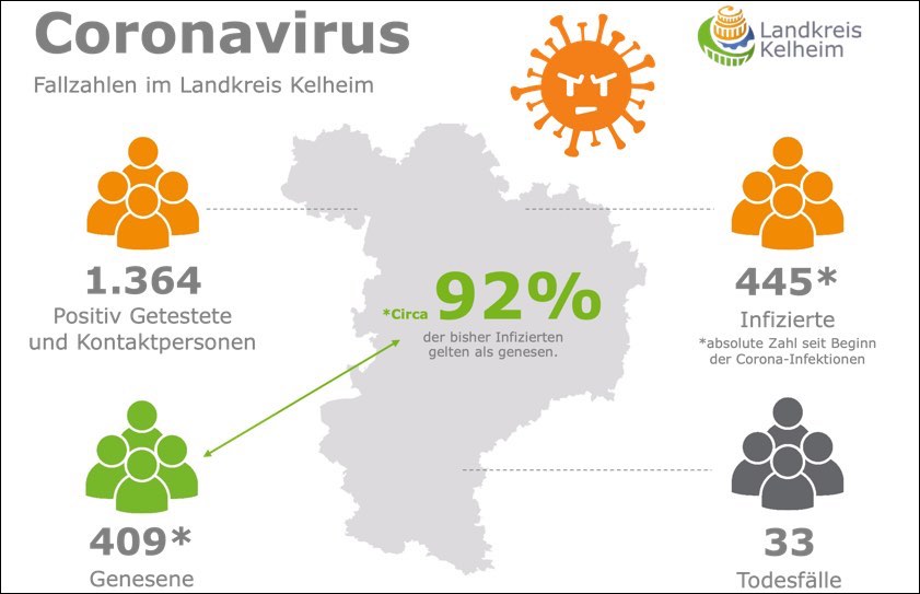 (ty) Im Kreis Kelheim gibt es, wie berichtet, in Zusammenhang mit der Corona-Pandemie bislang 33 Menschenleben zu beklagen. Die Zahl der bestätigten Corona-Fälle hat sich seit mehreren Tagen nicht mehr erhöht. Unter Verweis auf Daten des Gesundheitsamt teilte das Landratsamt mit, dass – Stand heute, 0 Uhr – die Zahl der im Kreis Kelheim positiv auf das neuartige Virus getesteten Menschen bei weiterhin 445 liegt. 409 hiesige Corona-Patienten – ebenfalls unverändert – gelten mittlerweile als genesen und sind aus der Quarantäne entlassen. "Das heißt: Zirka 92 Prozent der bisher Infizierten sind bereits wieder gesund", erklärt die Behörde.